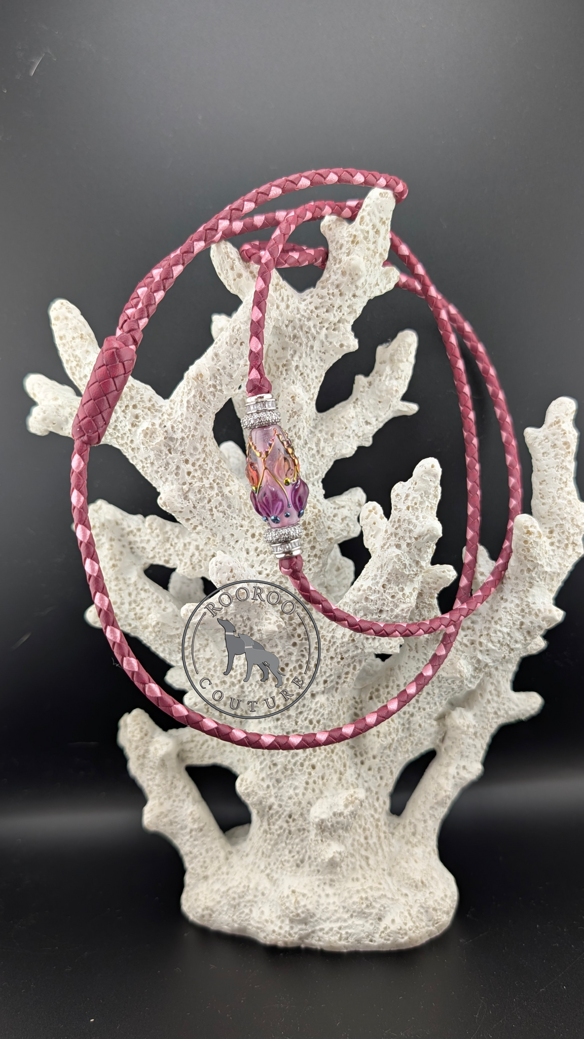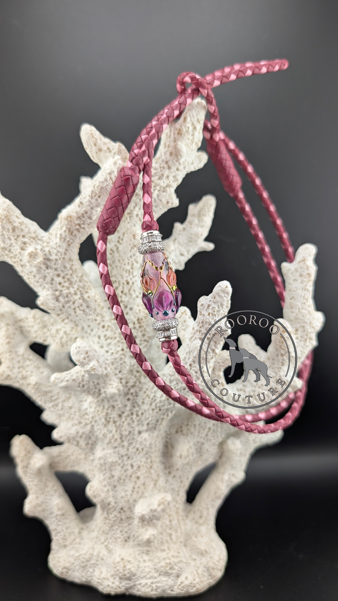 Perfectly pink in every way. The "Veronica" is made from rich cherise leathers with a delicate touch of custom ballet pink shimmer leathers. This lead features one stunning singular bead set with a one-of-a-kind hand crafted glass bead made by one of my favourite Ukrainian glass artists, Olia Oleksiichuk, accompanied by silver and crystal spacer beads, and is finished with two hand tied turkshead knots.